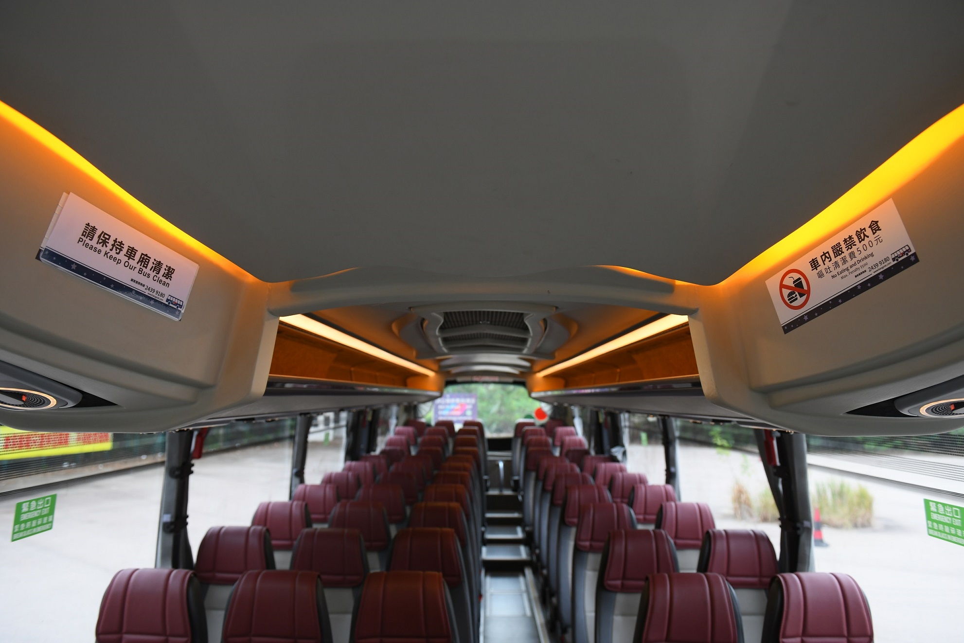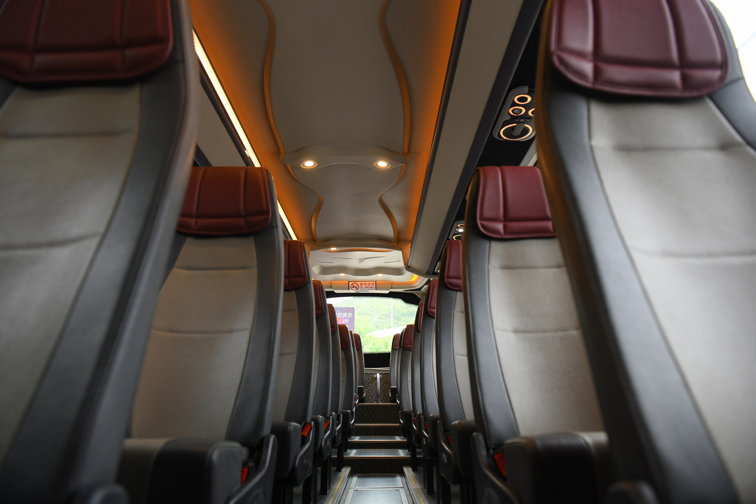 而車內的座位配置,在兩圖對比下,亦看到旅遊巴業界不斷創新的證明,以住的旅遊車座位採用絨布,現在的是採用獲歐盟認證的皮椅,靠背設計亦得到改良,更符合人體工學,適合長途旅程。