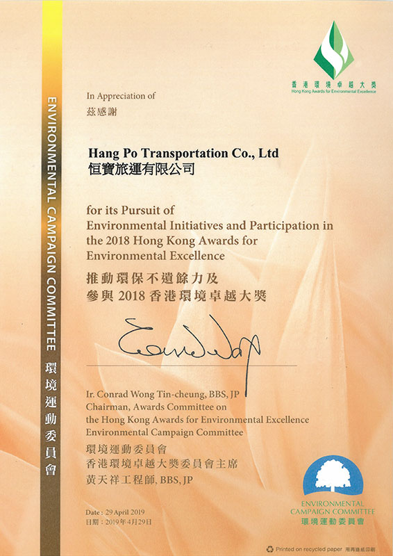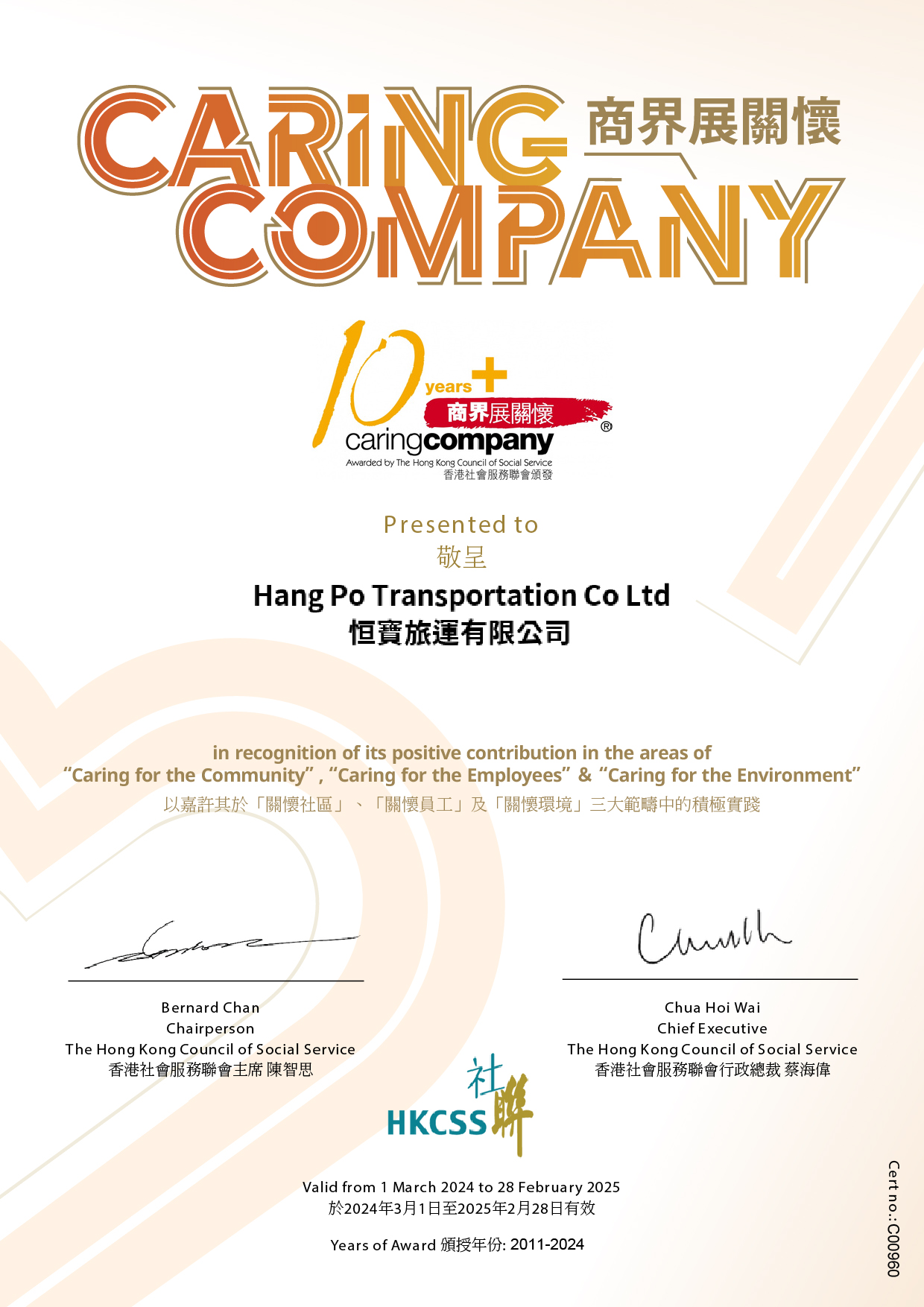 In addition to focusing on the coach rental business of HP, we also care for the society. Since 2011, we have been awarded the “Caring Company Logo” many times, showing that we are willing to fulfill our social responsibilities. Over the years, we have been committed to caring for the community and protecting the environment. We will donate to local charities every year to support them in helping communities in different sectors in Hong Kong. Secondly, we will also lead our staff to contribute to environmental conservation and participate in environmental protection activities, cultivating employees’ awareness of environmental protection and at the same time reinforcing their cohesiveness.