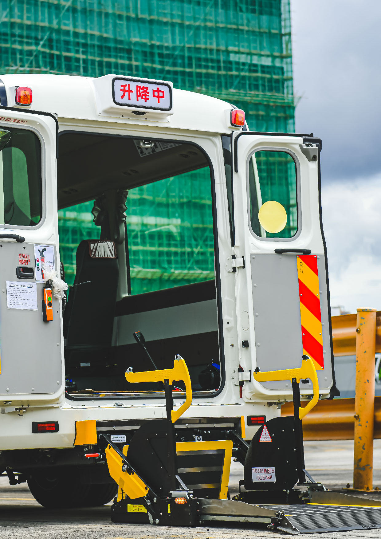 The new wheelchair accessible bus from Hang Po contains 19 regular seats and 2 wheelchair seats. The bus body is specially designed with various safety equipment. Motorized pedals are installed in order to shorten the distance between the bus door and the ground, making it easier for boarding. A wheelchair lift is provided at the rear of the vehicle, which allows wheelchair users to enter the compartment smoothly. Once on board, with the assistance of our driver, the wheelchair can be secured at the safety stabilizers on the bus that prevent from slipping off during the journey. Seat belt is also provided in every wheelchair space for passengers’ protection.