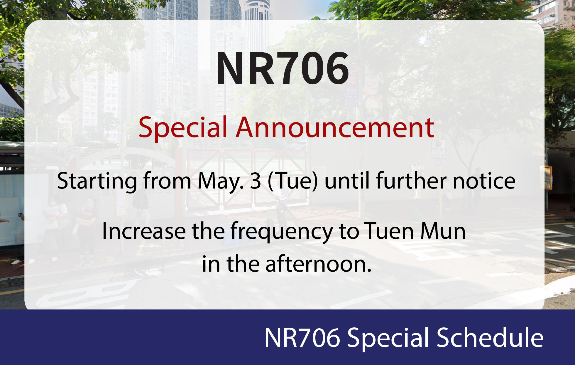 Starting from 25 April (Mon), there will be one more frequency of NR706 to Tuen Mun in the afternoon.