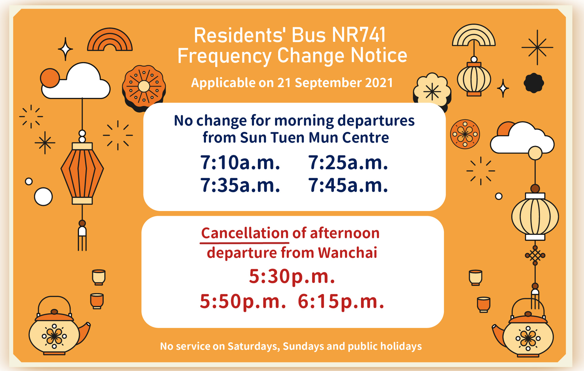 Residents’ Bus NR741 service will remain unchanged in the morning of Mid-Autumn Festival (21 September 2021), but will be suspended at 5:30pm, 5:50pm and 6:15pm respectively for return trips to Wan Chai.