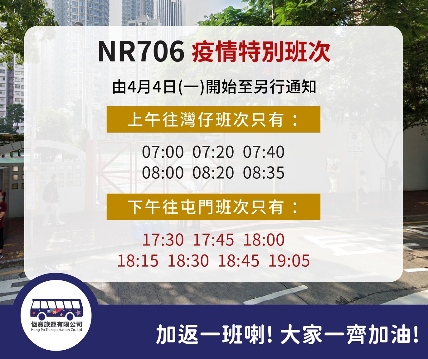 受疫情影响,由4月4日起(一)开始至另行通知为止,NR706将更改班次,下午往屯门班次将增加一班,敬请留意,如有任何不便之处,敬请体谅。